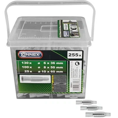 Brand: CONNEX Contents: 130x O6 mm, 100x O8 mm, 25x O10 mm Material: Polypropylene suitable for perforated and hollow bricks and concrete and masonry materials Brand quality for DIY and professionals, Weight: 0.8598028218 Pounds, Manufacturer: Conmetall