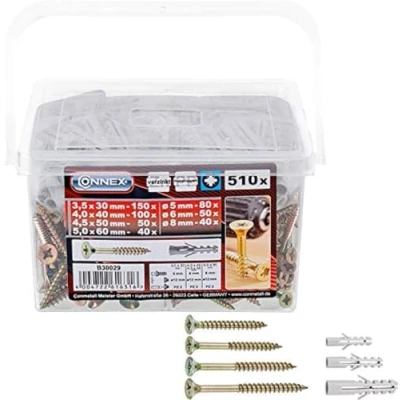 Content chipboard screws: 3.5 x 30 mm, 150 pieces 4.0 x 40 mm, 100 pieces 4.5 x 50 mm, 50 pieces 5.0 x 60 mm, 40 pieces Content dowel: 5 mm, 80 pieces 6 mm, 50 pieces 8 mm, 40 pieces Chipboard screw features: Pozidriv PZ drive Countersunk With anti-friction coating (allows improved screw) yellow zinc-plated Universal-rounder for wood constructions Brand quality for DIY and professionals, Weight: 2.1605301676 pounds, Manufacturer: Conmetall