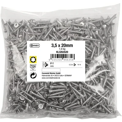 Universal use: universal screws for connecting all types of wood, ideal for outdoor use, sufficient supply of screws, thanks to 1 kg bulk pack, optimal equipment for home, hobby and workshop Full thread: thread extends over the entire screw length, ensures even distribution of high tensile and compressive forces, ideal for use in wood construction High-quality workmanship: high resistance to corrosion, thanks to stainless steel, TX drive for transmission of extremely high torques, flat surface and flush finish with the material, thanks to countersunk shape Product details: screw size: 3.5 x 20 mm, drive: TX, bit holder: TX10, dowel diameter: 5 mm, head shape: countersunk head, thread design: full thread, material: stainless steel, contents: 1 kg, Manufacturer: Conmetall Meister GmbH