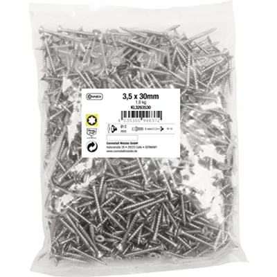 Universal use: universal screws for connecting all types of wood, ideal for outdoor use, sufficient supply of screws, thanks to 1 kg bulk pack, optimal equipment for home, hobby and workshop Full thread: thread extends over the entire screw length, ensures even distribution of high tensile and compressive forces, ideal for use in wood construction High-quality workmanship: high resistance to corrosion, thanks to stainless steel, TX drive for transmission of extremely high torques, flat surface and flush finish with the material, thanks to countersunk shape Product details: screw size: 3.5 x 30 mm, drive: TX, bit holder: TX10, dowel diameter: 5 mm, head shape: countersunk head, thread design: full thread, material: stainless steel, contents: 1 kg, Manufacturer: Conmetall Meister GmbH