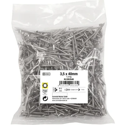 Universal use: universal screws for connecting all types of wood, ideal for outdoor use, sufficient supply of screws, thanks to 1 kg bulk pack, optimal equipment for home, hobby and workshop Partial thread: screws with thread-free shaft. Ideal for attaching wooden panels to wooden beams, e.g. For building terraces, two components to be screwed are neatly pulled together High-quality workmanship: high resistance to corrosion, thanks to stainless steel, TX drive for transmission of extremely high torques, flat surface and flush finish with the material, thanks to countersunk shape Product details: screw size: 3.5 x 40 mm, drive: TX, bit holder: TX10, dowel diameter: 5 mm, head shape: countersunk head, thread design: partial thread, material: stainless steel, contents: 1 kg, Weight: 2.20462262 pounds, Manufacturer: Conmetall Meister GmbH