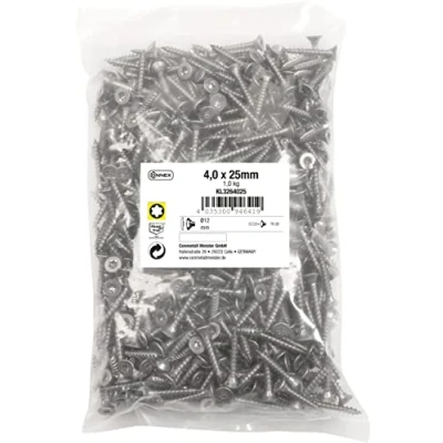 Universal use: universal screws for connecting all types of wood, ideal for outdoor use, sufficient supply of screws, thanks to 1 kg bulk pack, optimal equipment for home, hobby and workshop Full thread: thread extends over the entire screw length, ensures even distribution of high tensile and compressive forces, ideal for use in wood construction High-quality workmanship: high resistance to corrosion, thanks to stainless steel, TX drive for transmission of extremely high torques, flat surface and flush finish with the material, thanks to countersunk shape Product details: screw size: 4.0 x 25 mm, drive: TX, bit holder: TX20, dowel diameter: 6 mm, head shape: countersunk head, thread design: full thread, material: stainless steel, contents: 1 kg, Weight: 2.20462262 Pounds, Manufacturer: Conmetall Meister GmbH