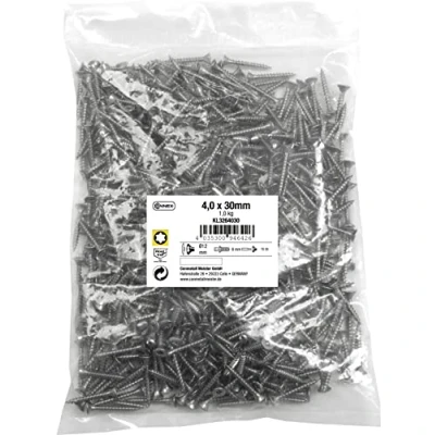 Universal use: universal screws for connecting all types of wood, ideal for outdoor use, sufficient supply of screws, thanks to 1 kg bulk pack, optimal equipment for home, hobby and workshop Full thread: thread extends over the entire screw length, ensures even distribution of high tensile and compressive forces, ideal for use in wood construction High-quality workmanship: high resistance to corrosion, thanks to stainless steel, TX drive for transmission of extremely high torques, flat surface and flush finish with the material, thanks to countersunk shape Product details: screw size: 4.0 x 30 mm, drive: TX, bit holder: TX20, dowel diameter: 6 mm, head shape: countersunk head, thread design: full thread, material: stainless steel, contents: 1 kg, Weight: 2.20462262 Pounds, Manufacturer: Conmetall Meister GmbH