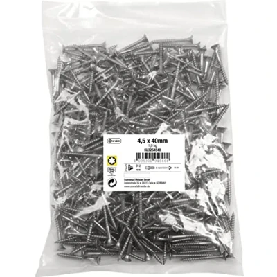 Universal use: universal screws for connecting all types of wood, ideal for outdoor use, sufficient supply of screws, thanks to 1 kg bulk pack, optimal equipment for home, hobby and workshop Partial thread: screws with thread-free shaft. Ideal for attaching wooden panels to wooden beams, e.g. For building terraces, two components to be screwed are neatly pulled together High-quality workmanship: high resistance to corrosion, thanks to stainless steel, TX drive for transmission of extremely high torques, flat surface and flush finish with the material, thanks to countersunk shape Product details: screw size: 4.5 x 40 mm, drive: TX, bit holder: TX20, dowel diameter: 6 mm, head shape: countersunk head, thread design: partial thread, material: stainless steel, contents: 1 kg, Weight: 2.20462262 Pounds, Manufacturer: Conmetall Meister GmbH