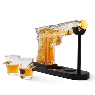 AmazonDetailed Pistol Themed Borosilicate Glass Decanter with Mahogony Effect Stand and Two 'Shot' Glasses Both Decanter and Glasses are Made from 100% Food Safe Lead Free Durable Borosilicate Glass Decanter Holds Around 220 ml (Around ⅓ of a Standard Bottle) with Each Glass Holding Around 50 ml Set is Embellished with Mahogany Effect Stand, Leak Proof Metal and HPR Stopper and Copper Alloy 'Rounds' Decanter on Stand Measures Around 28 cm by 17.5 cm by 10.5 cm || Some Assembly Required for Stand, Weight: 1.653466965 Pounds, Manufacturer: The Source Wholesale Limited