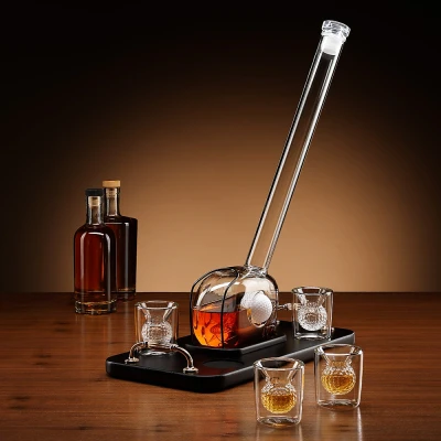 Amazon100% Foodsafe Handmade Golf Club Shaped Glass Decanter with Stopper and Goll Ball Glasses with Wooden Base Holding Around a 750ml this Decanter has been Designed to Look Like a Golf Club Hitting a Golf Ball Mid Swing Decanter, Stopper and Glasses are Made from 100% Foodsafe High Quality Glass with Composite Wooden Base An Ideal Gift for Golf Fans and Whisky Lovers and with the Wooden Base this Set Makes a Striking Centrepiece Decanter Measures Around 40 cm by 17 cm by 6 cm | Set on Base Measures Around 45 cm by 42 cm by 19 cm, Weight: 4.40924524 Pounds, Manufacturer: The Source Wholesale