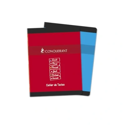 School format: Width: 17 cm x Height: 22 cm. Seyès large square ruler, in 2 colours, with a header and a double margin on the left. 124 pages – thickness 70 g. Recycled card cover, 300 g thick. Stapled binding 20 pages per day, Monday to Saturday, with tabs. Cover colour: random among 2 colours: red, blue Ecolabel EU certified (low environmental impact of paper manufacturing). Made in France.