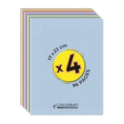 Conquérant, Set of 4 Classic Pastel Notebooks 17 x 22 cm, 96 Pages, Seyès Stapled Squares, Polypropylene Cover, Green, Lilac, Apricot, Blue