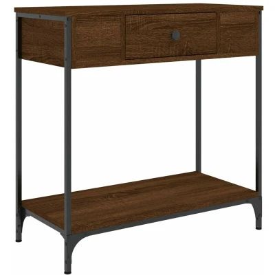 ManoManoGeneral description Add a touch of elegance to your entryway, living room, or hallway with this stylish console table. Made of high-quality engineered wood, this table features a smooth surface, strength, stability, and moisture resistance. It is easy to clean and offers ample storage space for magazines, books, decorative items, and other daily essentials, keeping them well-organized and within reach. The metal frame adds an industrial style to your interior while ensuring durability and stability. Technical specifications Colour: Brown oak Material: Engineered wood, metal Dimensions: 75 x 34.5 x 75 cm (L x W x H) Assembly required: Yes Installation To prevent it from being overturned, this product must be used with the provided wall attachment device. Other information