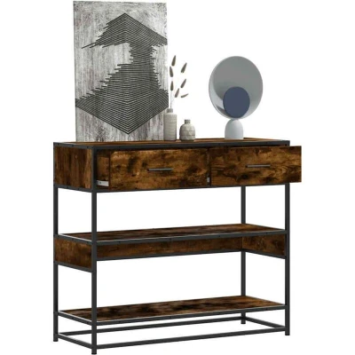 ManoManoGeneral description This console table offers ample storage space while complementing your home decor. It’s perfect for the living room, bedroom, and hallways. Technical specifications Colour: Smoked oak Material: Engineered wood, metal Overall dimensions: 90 x 35 x 80 cm (W x D x H) Maximum weight capacity (total): 60 kg Assembly required: Yes Installation To prevent it from tipping over, this product must be used with the provided wall attachment device. Usage Ample storage space: This hall table has drawers and shelves to keep your magazines, books, remote controls, and other small items within reach. Sturdy tabletop: The hallway table has a sturdy tabletop, suitable for placing food, drinks, or displaying decorative objects like photo frames or potted plants. Easy to maintain: Thanks to its smooth surface, the hallway stand is easy to clean with a damp cloth and requires less maintenance. Other information