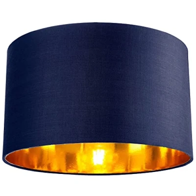 Contemporary and stylish high quality circular drum shape lamp shade. Made of high quality midnight blue cotton fabric with unique shiny copper paper inner creating a stunning effect when the light bulb is switched on. The product dimensions are: Height - 22cm, Top diameter - 35cm, Bottom diameter - 35cm. Maximum wattage allowed is 60w. Features a reversible gimbal allowing usage for both table/floor lamps and pendant ceiling roses. Please note that only one shade is included. Complete with shade reducer ring allowing for most lamp lamp bases - B22/BC, E14/SES and E27/ES. Light bulb not included., Weight: 2.0502990366 Pounds, Manufacturer: Happy Homewares