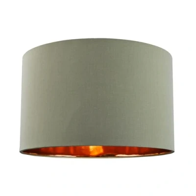 Contemporary and stylish high quality circular drum shape lamp shade. Made of high quality olive green cotton fabric with unique shiny copper paper inner creating a stunning effect when the light bulb is switched on. The product dimensions are: Height - 22cm, Top diameter - 35cm, Bottom diameter - 35cm. Maximum wattage allowed is 60w. Features a reversible gimbal allowing usage for both table/floor lamps and pendant ceiling roses. Please note that only one shade is included. Complete with shade reducer ring allowing for most lamp lamp bases - B22/BC, E14/SES and E27/ES. Light bulb not included., Weight: 2.094391489 Pounds, Manufacturer: Happy Homewares