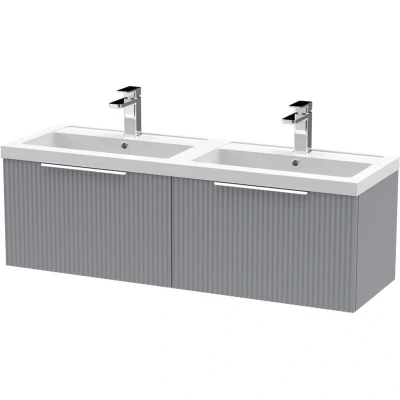 Contemporary Fluted 1200mm Wall Hung 2 Drawer Bathroom Vanity Unit with Double Polymarble Basin Satin Grey