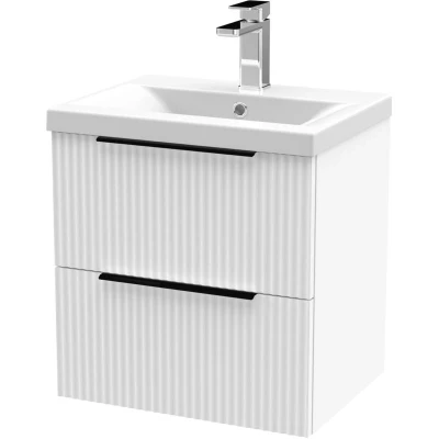 Contemporary Fluted Front Wall Hung 2 Drawer Bathroom Vanity Unit with 1 Tap Hole Basin, 500mm, Satin White, Black Handles