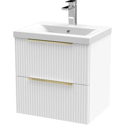 Contemporary Fluted Front Wall Hung 2 Drawer Bathroom Vanity Unit with 1 Tap Hole Basin, 500mm, Satin White, Brushed Brass Handles