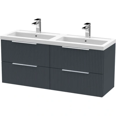 Contemporary Fluted Front Wall Hung 4 Soft Close Drawer Bathroom Vanity Unit with Double Polymarble Basin, 1200mm, Dark grey