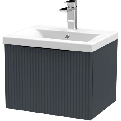 Contemporary Fluted Front Wall Hung Single Drawer Bathroom Vanity Unit with 1 Tap Hole Basin, 500mm, Dark Grey, Black Handles