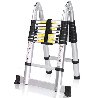Telescopic ladder: aluminium telescopic ladder length 5 m, maximum load 150 kg, folded size: 93 x 46 cm (L x W). 16 non-slip steps 【Flexibility】: You can bend it in half, cut each end individually, or extend 5m in total. Suitable for indoor and outdoor use. Adjust the height to the desired position as needed Robust and robust: aluminium frame, robust sides made of PCV. Rust resistant and durable in construction, even if the light weight does not say. Rungs with square profile for a safe step. Compact and easy to store Safety: the balance bar provides very good stability for safe use. The bottom of the telescopic ladder has a black non-slip rubber that helps to fix it in place Practicality: Ideal as a staircase for the attic as well as for the whole house and work environment, but also for activities outside the home or in the garden, Weight: 39.68320716 Pounds, Manufacturer: COOCHEER
