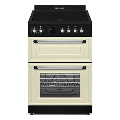 Cookology RETDO600CRM Freestanding 60cm Wide, Retro Double Cavity Grill Oven Cooker with Ceramic 4 Zone Hob and Analogue Dials in Cream