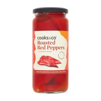 Cooks&Co Roasted Red Peppers 460g are authentically Mediterranean sun-ripened peppers, expertly roasted for a sweet, succulent flavour. Perfect for adding to salads, pasta, and antipasti, they are vegan-friendly, versatile, and come ready to use in a convenient glass jar.