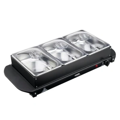 GENEROUS CAPACITY: The Cooks Professional 3-section buffet food warmer boasts a generous combined capacity of 4.5 litres, making it a perfect choice for home entertaining. The ample capacity allows you to effortlessly serve your family and friends with hot food. MULTI-FUNCTION: Designed with versatility in mind, this buffet warmer features three separate 1.5 litre sections for storing a variety of dishes, including meats, vegetables, curries, soups, side dishes and more. In addition to its buffet warming capabilities, this appliance can be transformed into a flat hotplate within seconds. This flexibility allows you to expand your menu options, making it a valuable addition to your kitchen. TEMPERATURE CONTROL: The buffet food warmer features an adjustable temperature dial which allows you to customise the temperature between 60-80°C. The powerful hotplate ensures even heating, keeping your dishes at the perfect serving temperature for parties and gatherings. A built-in indicator light informs you when the unit is warming, turning off once the desired temperature is reached. CONVENIENT & PORTABLE: The Cooks Professional Buffet Warmer is designed for ease of use. It includes clear lids for each section to lock in heat and moisture. Additionally, it features two sturdy and safe handles for easy transportation and table-top serving, making it a user-friendly and practical choice for your entertaining needs., Manufacturer: Cooks Professional