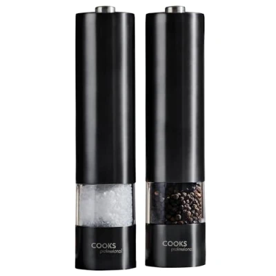CULINARY PRECISION MADE EASY: Elevate your dishes to gourmet status with one-handed electric pepper mill set. The electric salt and pepper grinder set, powered by 4 x AA batteries (not included), feature an effortless touch-button operation that makes you the culinary star of your kitchen. CUSTOMIZABLE SEASONING MASTERY: Master the art of seasoning with fully adjustable grinding settings of our electric salt grinder, allowing you to go from a fine dusting to a hearty sprinkle. Enjoy the sensory delight of freshly ground sea salt and whole peppercorns. TIMELESS STAINLESS STEEL DURABILITY: Crafted from high-grade stainless steel, our salt and pepper grinder set electric innovation is not only visually appealing but also built to last. The compact dimensions of D5.2 x H22.3cm mean the electric salt mill set will effortlessly fit into your kitchen setup. HASSLE-FREE REFILLS: Say goodbye to messy refills with our automatic salt and pepper grinder set. The streamlined refill system makes it a breeze to replenish your electric salt and pepper mill set. Simply twist the top lid counterclockwise, remove it, and fill the base effortlessly UNLEASH YOUR CULINARY CREATIVITY: Our salt & pepper grinder for kitchen has a one-touch system that enables easy, one-handed operation. Free up your other hand for creative cooking techniques, whether you're sautéing, roasting, or plating. The electric pepper grinder set keeps your seasonings at your fingertips for culinary artistry., Weight: 1.4109584768 pounds, Manufacturer: Cooks Professional