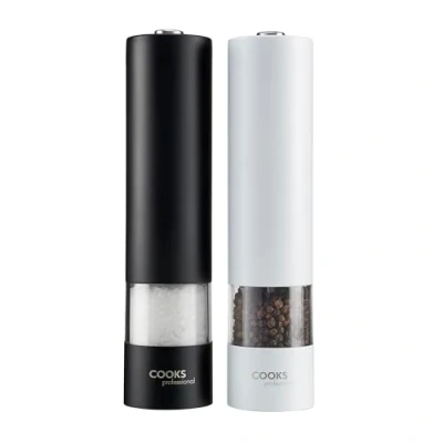 CULINARY PRECISION MADE EASY: Elevate your dishes to gourmet status with one-handed electric pepper mill set. The electric salt and pepper grinder set, powered by 4 x AA batteries (not included), feature an effortless touch-button operation that makes you the culinary star of your kitchen. CUSTOMIZABLE SEASONING MASTERY: Master the art of seasoning with fully adjustable grinding settings of our electric salt grinder, allowing you to go from a fine dusting to a hearty sprinkle. Enjoy the sensory delight of freshly ground sea salt and whole peppercorns. TIMELESS STAINLESS STEEL DURABILITY: Crafted from high-grade stainless steel, our salt and pepper grinder set electric innovation is not only visually appealing but also built to last. The compact dimensions of D5.2 x H22.3cm mean the electric salt mill set will effortlessly fit into your kitchen setup. HASSLE-FREE REFILLS: Say goodbye to messy refills with our automatic salt and pepper grinder set. The streamlined refill system makes it a breeze to replenish your electric salt and pepper mill set. Simply twist the top lid counterclockwise, remove it, and fill the base effortlessly. UNLEASH YOUR CULINARY CREATIVITY: Our salt & pepper grinder for kitchen has a one-touch system that enables easy, one-handed operation. Free up your other hand for creative cooking techniques, whether you're sautéing, roasting, or plating. The electric pepper grinder set keeps your seasonings at your fingertips for culinary artistry., Manufacturer: Cooks Professional