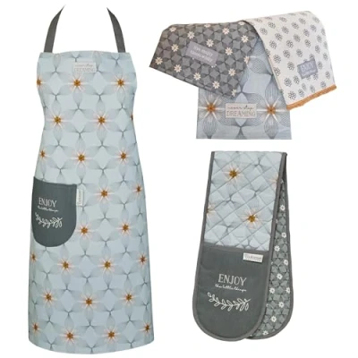 COMPLETE KITCHEN TEXTILES SET: Elevate your kitchen experience with this comprehensive 5-piece set including an apron, oven glove, and three tea towels for kitchen use. HIGH-QUALITY MATERIALS: Crafted from premium fabrics, our apron, oven gloves, and tea towels are designed to withstand daily use while maintaining their durability and style. VERSATILE USAGE: Whether you're baking, cooking, or hosting, our apron and oven gloves provide essential protection while our tea towels offer versatile utility for cleaning, drying, or covering food. STYLISH DESIGN: Add flair to your kitchen attire with our stylish apron and coordinating tea towels, featuring classic patterns and vibrant colors to complement any decor. PERFECT GIFT: Ideal for aspiring chefs, seasoned cooks, or anyone who loves spending time in the kitchen, this set of aprons and tea towels make a thoughtful and practical gift for any occasion.