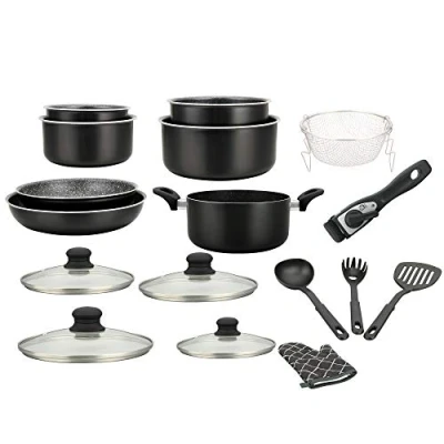 Complete set: This set has 17 pieces. It consists of 4 saucepans, 2 different sized frying pans with removable handle, 1 cooking pan, 1 cooking basket, 4 lids, 3 utensils and a kitchen glove, non-stick pans made of thick forged aluminum, stackable elements for easy storage MULTIFUNCTIONAL PRODUCTS: Made of thick forged aluminium with marble coating, the cooking elements are non-stick and very sturdy and durable over time. They offer a fast and balanced heat distribution and are suitable for all types of fire including induction International products have separate terms, are sold from abroad and may differ from local products, including fit, age ratings, and language of product, labeling or instructions.