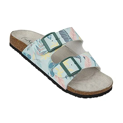 Faux leather strap. Anatomically shaped faux leather footbed, EVA and rubber mix outsole