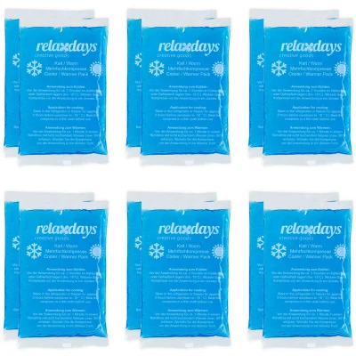 General description These versatile gel compresses are suitable for both cold and warm applications, making them an essential item for any medicine cabinet. Cold treatment with the cooling pads helps relieve the pain of sprains and bruises, while heat therapy stimulates circulation, alleviates tension, and aids in relieving period, abdominal, and back pain. Technical specifications Dimensions: 9 x 15 cm Weight: approx. 100 g Material: plastic (PE), gel Color: blue, white Temperature range: Remain malleable down to -18 °C Installation For cold application: Place in refrigerator or freezer (up to -18 °C) for approx. 2 hours before use. For warm application: Heat in a water bath (max. 80 °C) for 1 minute or in the microwave (800 W) for 40 seconds before use. Before use, wrap in a thin cloth to avoid burns. Use on children only under adult supervision. Usage Do not use compresses for longer than 20 minutes. Never use a damaged compress. Other information Included in delivery: 12x cold