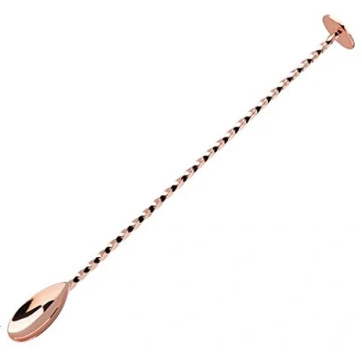 Twisted mixing spoon Material: Copper plated stainless steel Handwash only On trend copper finish Flat end for muddling cocktail ingredients