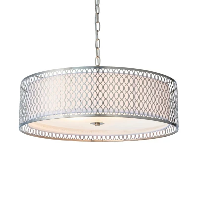 This is a classic circular light with a trendy geometric fretwork metal outer and an inner fabric shade for lovely light diffusion. Height adjustable rope chain.