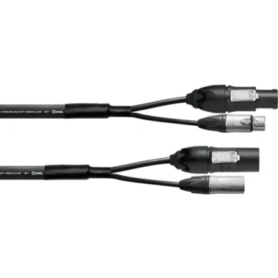 The CPH_DMX15PW125-TRUE1 is a DMX/PowerCON hybrid cable, incorporating a 5-point DMX link and thick electrical cable. The power is carried out using a 2.5 mm² 3-conductor cable that offers greater performance and safety with demanding equipment. Equipped with Neutrik PowerCON True1 connectors, it can be plugged or disconnected under load, is lockable and supports up to 16 amps at 230V. Connectors: PowerCON True1 / XLR female 5-pole, PowerCON True1 / XLR 5-pole male - Length (m): 15 m - Shielding type: tinned copper braid and laminated aluminum foil - Conductors: 2 x 0.22 mm² (AWG 24, DMX) / 3 x 2.5 mm ( AWG 14, Power ) - Conductor structure: 7 x 0.2 mm tinned copper / 50 x 0.25 mm bare copper (feed)