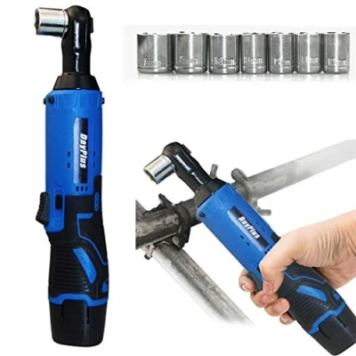 Cordless Ratchet Wrench 3/8 Inches, 12V 40Nm Electric with 2 x 1500mAh Batteries, 1Hour Fast Charger, 7 Sockets, Right Angle (Blue)