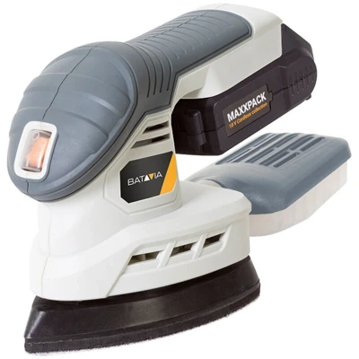 General description The Batavia MAXXPACK Delta Sander is designed for versatility and ease of use. Its compact and lightweight design allows for easy maneuverability, making it ideal for sanding hard-to-reach places. The sander fits comfortably in your hand, reducing fatigue during extended use. It comes equipped with a dust collection tray to keep your workspace clean and free from dust and debris. The quick and easy sheet change is facilitated by a hook & loop system, enhancing efficiency during your projects. This model is part of the MAXXPACK collection, which features a universal battery and charger compatible with all your tools. Please note that this product is supplied as a Bare Unit, meaning it does not include a battery or charger. Technical specifications No Load Speed: 12,000/min Sanding Surface: 140 x 140 x 80 mm Sound Pressure Level LpA: 70 dB(A) Weight: 0.8 kg (without battery)