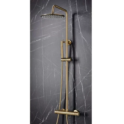 Core Brushed Brass Thermostatic Round Rigid Riser Shower Valve Two Heads