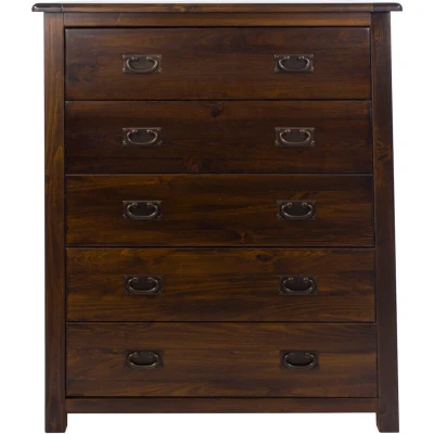General description This attractive Boston 5 Drawer Chest is made from dark-colored pine with an external finish of dark tinted lacquer. Technical specifications Dimensions: Width 900mm, Depth 400mm, Height 1150mm Weight: 35kg Supplied flat packed Approximate assembly time: 60 minutes by 1 person