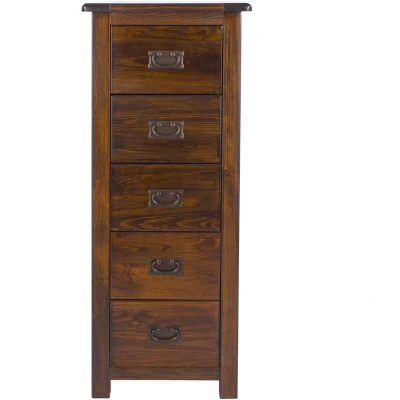 General description This attractive Boston 5 Drawer Narrow Chest is made from dark-colored pine with an external finish of dark tinted lacquer. Technical specifications Dimensions: Width 450mm, Depth 400mm, Height 1150mm Weight: 21kg Supplied flat packed Approximate assembly time: 60 minutes by 1 person