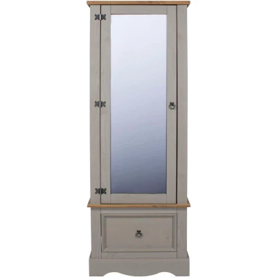 General description This Corona Grey Washed Mirrored Armoire features a stylish design with a single drawer and a mirrored door, providing a medium storage solution for your home. It is constructed from solid South American Pine with a grey washed effect and finished with a grey washed wax, ensuring both strength and reliability while adding a modern touch to your decor. Technical specifications Material: Solid Pine Finish: Grey Washed Wax Dimensions: W 660mm x D 555mm x H 1877mm Internal Hanging Rail: Yes Handles: Drop Ring Pull Handles Installation Delivered flat packed for self-assembly Includes full instructions, tools, and fixings for easy assembly