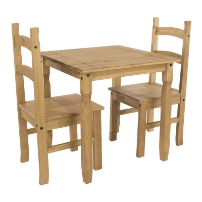 General description This great value square dining table with 2 chairs is ideal where space is a premium, made from solid pine and finished in antique effect wax. Technical specifications Dimensions (WxDxH): 750mm x 750mm x 750mm
