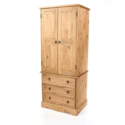 General description Corona 2 Door, 3 Drawer Wardrobe is a stylish and functional storage solution for your home, crafted from high-quality pine with an antique waxed finish. Technical specifications Materials: Pine Colour: Antique Waxed Pine Dimensions (DxWxH): 765mm x 555mm x 1877mm Weight: 42.5kg