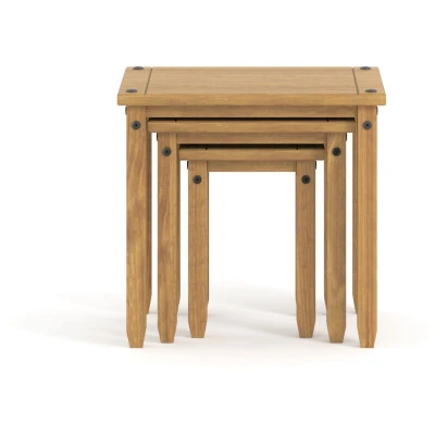 General description This attractive Corona Nest of Tables is made from medium-colored pine with an external finish of antique wax. Technical specifications Dimensions: Width 530mm, Depth 350mm, Height 511mm Weight: 12kg Assembly time: Approximately 40 minutes by 1 person