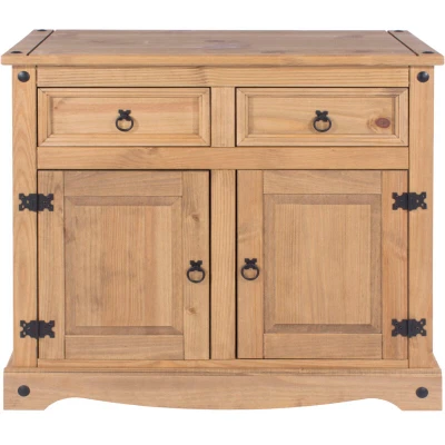General description This attractive Corona Small Sideboard is made from medium-colored pine with an antique waxed finish. It features two raised and fielded panel inset doors and a removable shelf, making it a stylish and functional addition to any home. Technical specifications Dimensions: Width 910mm, Depth 435mm, Height 806mm Weight: 27.5kg Assembly time: Approximately 60 minutes by 2 persons