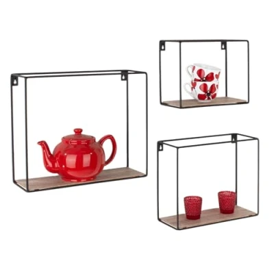 A fashionable rectangular display wall shelf set Made from high-quality metal with a wood effect A wall mount installation type Designed for easy storage Suitable for use in living room, hobby room or kitchen Included Components: 1 x core products rectangular display wall shelf 3-piece set with metal frame & wood effect, black