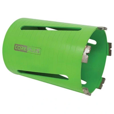 General description The CorePlus Diamond Dry Core Drill Bit (102mm) delivers a smooth drilling experience, designed for efficiency and durability. Technical specifications Diameter: 102mm Diamond segment thickness: 8mm Thread type: 1/2in BSP Compatibility and accessories Compatible with standard core drilling machines and accessories. 22mm and 28mm variants have a 10mm Hex Shank and do not require an arbor accessory. Usage Ideal for dry core drilling applications. Features ribbed core body and V-groove segments for fast debris clearing and continuous cutting action. Aerated core design enhances cooling and extends core life.