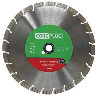 General description The CorePlus GP350 General-Purpose Hybrid Turbo Diamond Blade is designed for versatility and efficiency in cutting various materials. It features hybrid turbo technology (HTT) with interspersed turbo segments that provide an optimal balance between longevity and cutting speed. Technical specifications Diameter: 350mm Bore: 25.4mm Segment Height: 15mm Segment Width: 3.5mm Other information Manufactured to EN 13236 quality standard. Precision-engineered, high-grade steel tensioned core for true spinning. High concentration of premium-grade diamond per segment to prevent glazing during use.