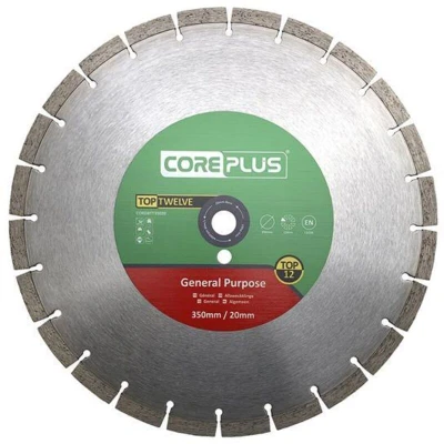 General description CorePlus Top Twelve General Purpose Cutting Blades provide low-cost cutting in a wide variety of building materials. The blades feature premium graded quality diamond segments and a tensioned high-grade steel core, ensuring durability and performance. Technical specifications Blade Diameter: 350mm Bore: 20mm Segment Size: 12mm Segment Width: 3.4mm Max. RPM: 4,400/min Compatibility and accessories Suitable for cutting concrete, concrete lintels, reinforced concrete lintels, hard sandstone, concrete pipes, concrete paving slabs, bricks, block paving slabs, concrete kerbs, clay pipes, hard slate, roofing tiles, quarry tiles, etc.