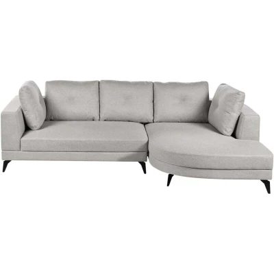 General description This modern corner sofa adds a stylish touch to any living room. Upholstered in water-repellent faux linen fabric, it ensures spills stay on the surface without staining. The sofa features sturdy black iron legs for stability and five backrest cushions with removable covers for easy cleaning. Its versatile grey color complements a wide range of decor styles. Technical specifications Product Type: Corner Sofa Style: Modern General Color: Grey, Black Main Material: Faux Linen Additional Material: Iron Filling Material: Foam Material Composition: 100% Polyester Shape: L-Shaped Arm Style: Track Orientation: Left Hand Pattern: Solid Seat Construction: Pocket Springs Seat Foam Density: 30 kg/m3 Seats Up To: 3 People Dimensions: Armrests Height: 64 cm, Depth: 151 cm, Seat Thickness: 17 cm, Seat Height: 73 cm, Width: 262 cm, Height: 88 cm, Seating Surface: 177x108 cm Weight: 98 kg Weight Capacity per Person: 137 kg Installation Partial Assembly Required Estimated Assembly