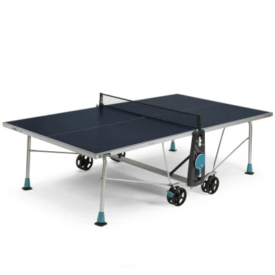 A great choice for fun, competitive matches with family and friends, the Cornilleau Sport 200X is a full-size rollaway outdoor table tennis table offering a combination of stability and durability. This robust, fully weatherproof ping pong table is compact, easy to assemble and wheelchair friendly. It has a 5mm resin laminate playing surface with Soft MAT Top® anti-glare coating to provide a consistent bounce and impact resistance. A sturdy 40mm (1.6') corrosion and scratch-resistant steel frame makes the 200X solid and stable, whilst ø 38mm (1.5') straight legs with adjustable feet deliver a perfectly level playing surface even on uneven ground. Plus, there is a tension adjustable polyethylene net and posts integrated to the side panels, and the table allows for solo practice thanks to a playback facility. To keep the accessories within easy reach, the table features bat & ball storage for 2 bats and 4 balls. The 200X can be quickly and easily folded for space-efficient storage with Compact Folding System and boasts Push'N Lock technology with 8 locking points for added safety and a secure placement in a storage and playing position.